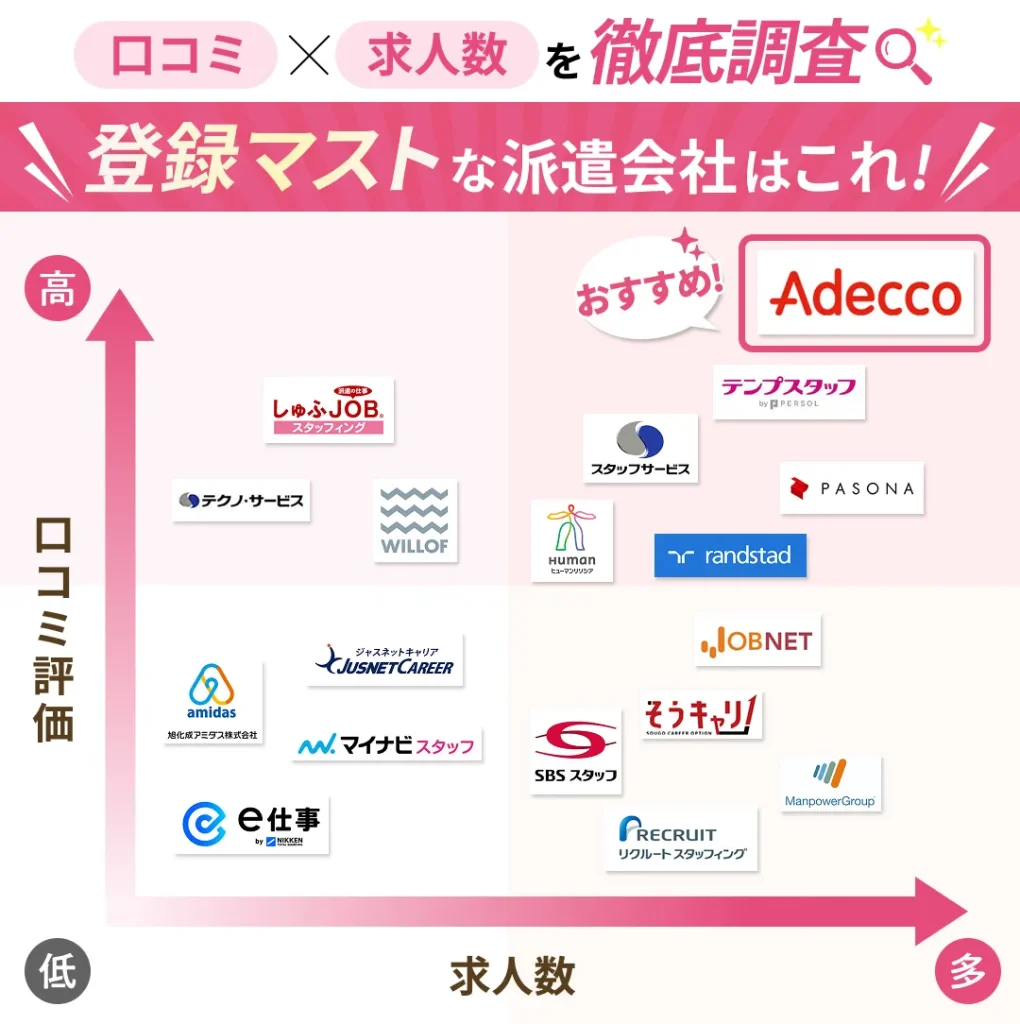 今回、利用者の口コミと求人数を徹底的に調べ上げて、あなたの理想を叶えてくれる派遣会社はどれなのかをまとめました!